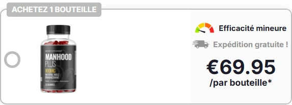 Il est conseillé d’utiliser Manhood Plus pendant au moins 3 à 5 mois pour obtenir des résultats optimaux. Cela vous permettra d’atteindre vos objectifs. Vous pouvez l’acheter mensuellement, mais nous vous recommandons d’acheter 3 bouteilles (pour 3 mois) ou 6 bouteilles (pour 6 mois), car la réduction est exceptionnelle et correspond au temps minimum nécessaire pour constater des résultats. Attention, cette réduction n’est pas valable toute l’année. Profitez-en tant que vous le pouvez !